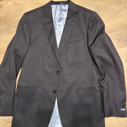 Fint jakkesæt, brugt til 2 fester. Bukserne er smalle nederst. Lagt ned hos skrædder. Nypris ca 1000,-