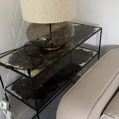Konsolbordplader er fremstillet i genbrugsglas, som fremstår og giver assosiationer til skyer på en smuk aftenhimmel. Hver bordplade er unik og farven er vintage mørk metallic. Bordets ben er i fremstillet i mat sort stål.