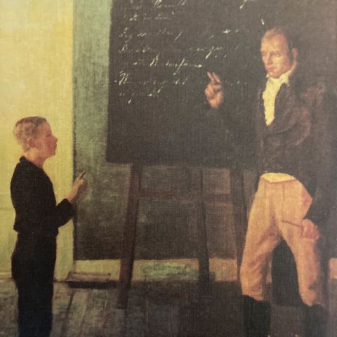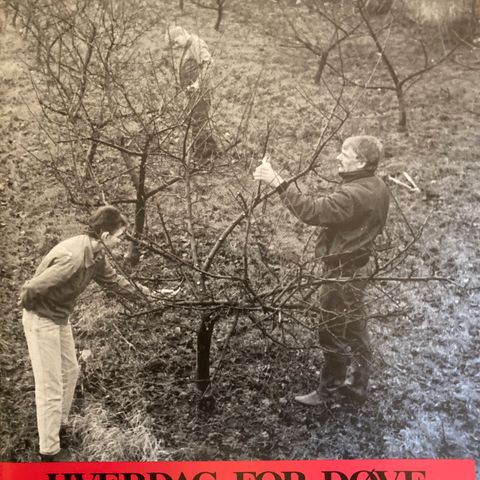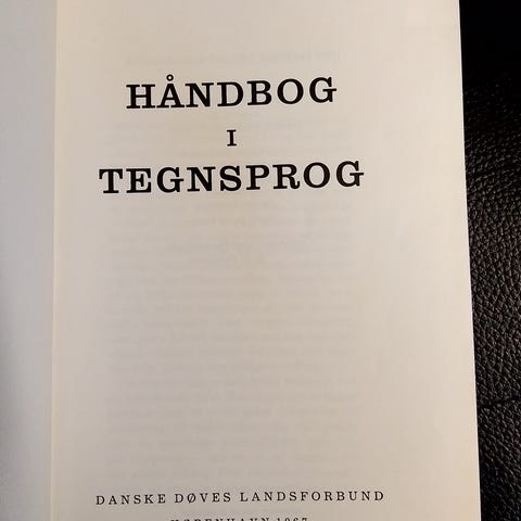 Studiebog fra tegnsprogstolkeuddannelsen. Bogen er beklædt med mat film og hvid film bagerst, som dækker over stempel. Døve tegnsprog