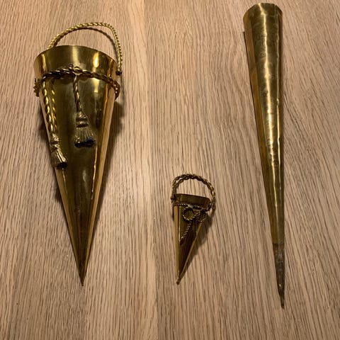Julepynt i messing bestående af stort kræmmerhus, 2 mindre stager til fyrfadslys og 1 lidt større lysestage.