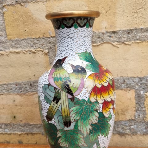 Cloisonne vase , Håndlavet kinesisk vase, Fin vase på fod. Lille slag i lakken. Højde 24 cm incl. fod.