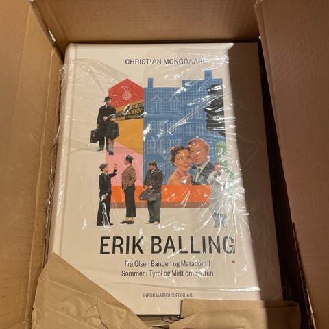 Den nye hardbackudgave af Christian Monggaards biografi, “Erik Balling - Fra Olsen Banden og Matador til Sommer i Tyrol og Midt om natten”. Helt ny og i ubrudt plombering - kun lille trykmærke øverst på kanten af forsiden.