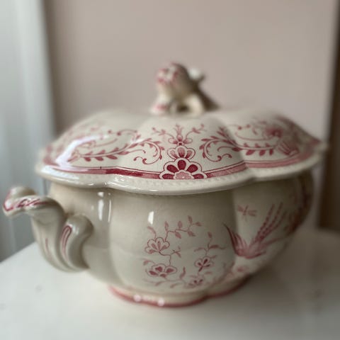 Smukkeste kæmpefad fra svenske Gefle ‘Fenix’. Lys creme med douche rosa dekor. Ingen skår ell revner, kun alderssvarende krakeleringer, der giver den rette patina.