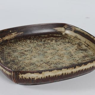 Fabelagtig og unik Ivan Weiss stentøjs fad (eller bakke) med abstrakt dekoration i dæmpede farver, 1. sortering og fremstillet hos Royal Copenhagen