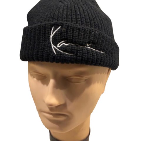 Sælger en enkel og funktionel hue fra mærket Kramp. Huen er grå og sort med et stilrent “K”-logo på venstre side.