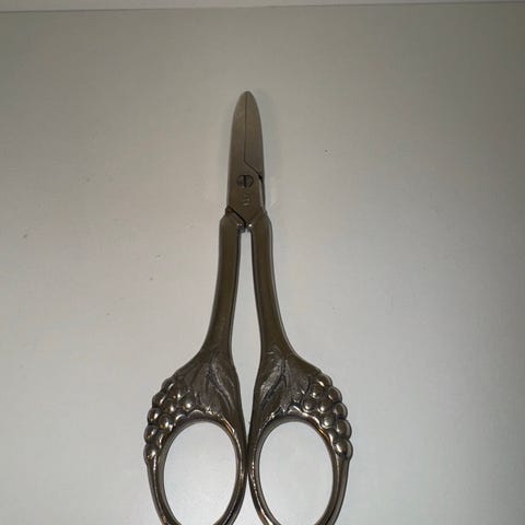 Druesaks fra Solingen. 15,5 cm lang, og flot dekoreret med drueklaser.