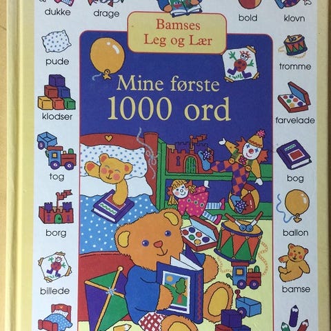 Mine første 1000 ord - Bamses Leg og Lær. Af Nicola Baxter og Susie Lacome. Findebog. Aktivitetsbog. Find Bamse inde i bogen. Hardback. Ekstra stort format. Farveillustrationer. Forlaget Egmont Litas, 1999. Pænt eksemplar