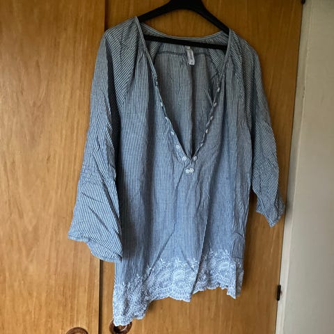 Bluse i let gennemsigtig stof i blålige nuancer