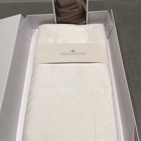 Georg Jensen dug, helt ny - stadig i original emballage. Dugen måler 140 x 240 cm og er hvid med mønster (se billeder).