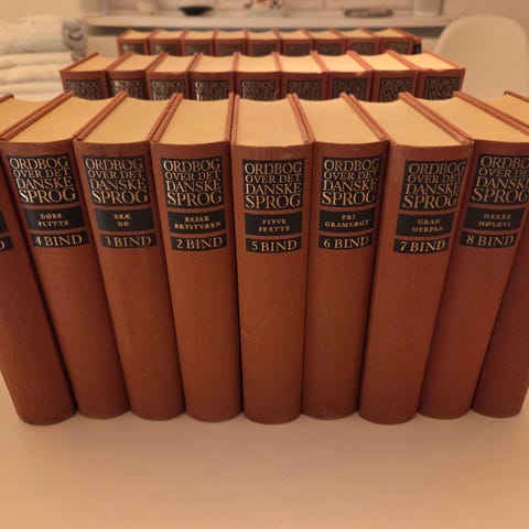 Den komplete samling af Ordbog over det danske sprog i flot rød indbinding. Alle 28bind eller 155cm smukke hyldemeter, hvis du bare skal bruge dem til bogpynt.