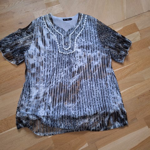 Tunikaen har v-hals med knaplukning med blondekant - lille slids ved ærmet.