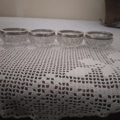 Glas, 3 saltkar, 6 kantet, slebent, 3 saltkar, krystalglas, 6 kantede, slebne, h ca 3 cm, Ø ca 6 cm, ca. 1900, enkelte små afslag i inderkanterne, dekorative i vindueskarmen med sol på, uundværlige på en hvid dug