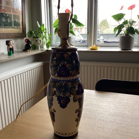 Smuk keramik lampe fra Alma - har været en vase i sin tid ser det ud til - men indsats lavet professionelt af gørtler. Virker og lampeskærm følger med HViS du kan afhente. Sender helst ikke - Og i så fald bliver det UDEN lampeskærm til samme pris plus fragt. Fra røgfrit hjem. Vintage.
