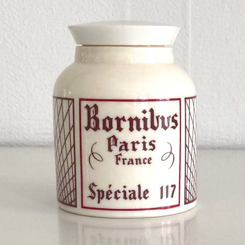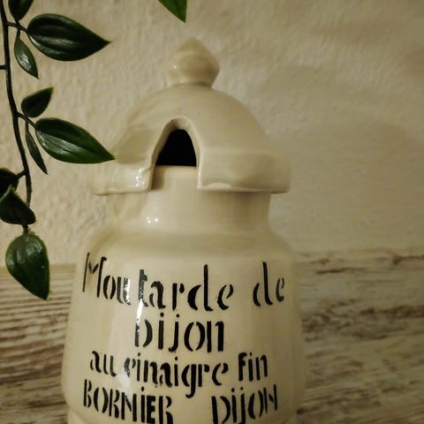 En skøn og dekorativ gammel fransk sennepskrukke / låg krukke der engang har indeholdt Dijon sennep. Krukken er udført i fajance og produceret af Digoin for den velrenommeret Parisiske sennepsproducent Bornibus.