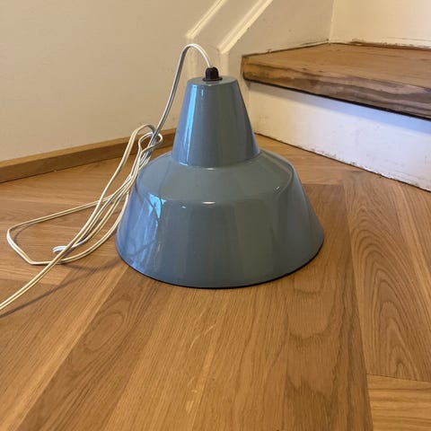 Fed hvid værkstedslampe fra Louis Poulsen. Flot med lige den rette patina (hvis man er til det). Der monteret funky grøn ledning (ca. 170cm) med stik, så den er lige til at tage i brug.