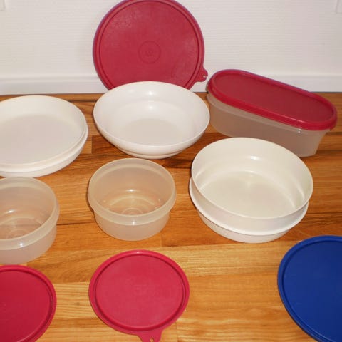 3 solide Tubberwareskåle i ok stand. De er brugt, men fuld funktionelle uden revner eller andet. Blå, turkis og grøn alle med hvidt låg. Kan stables.