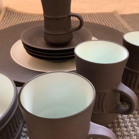 Kande og 2xKop + underkop designet af Quistgaard. Sælges til 500