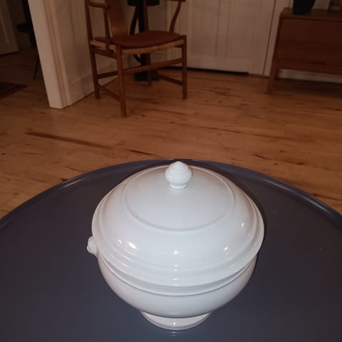 Pillivuyt, Hvid suppeterrin med greb af løvehoveder.