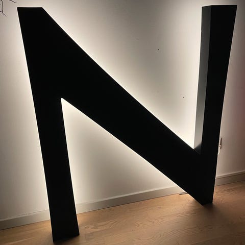 Et stort n fra en butiksfacade, med indbygget led lys.