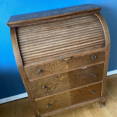 Bemærk: Den ene skuffe mangler en indvendig kæde, hvilket betyder, at den ikke hægter helt perfekt ved åbning – men ellers fungerer alt som det skal.