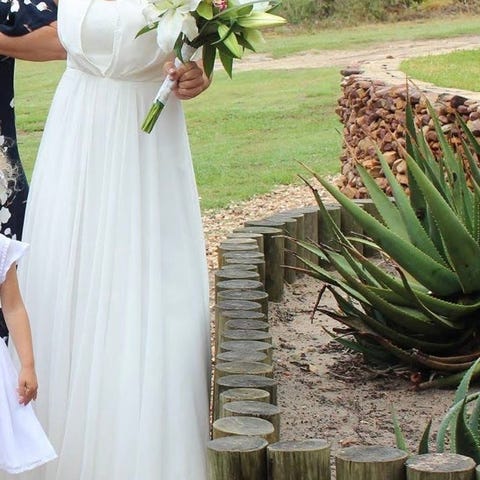 Smuk brudekjole som kræver en rens, da blonde delen er blevet lidt gullig, og der er lidt pletter hist og pist. Sælges derfor ekstrem billigt. Fra røg og dyrefrit hjem. Afhentning i Ishøj landsby.