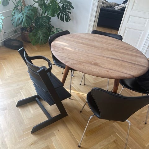 Brugt spisebord med ridser i overfladen. Lyst laminat bøg og dertil 2 plader på 40 cm.