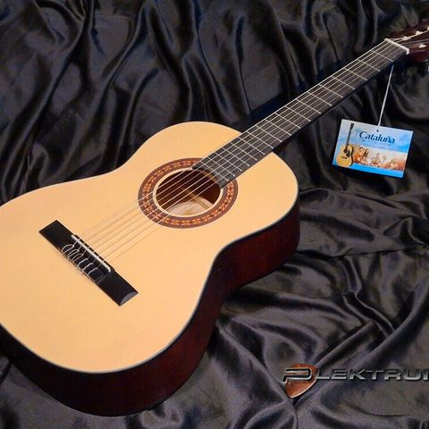 Spansk/klasisk børneguitar med gulvstativ og tone måler samt plekter. Den er brugt meget få gange og derfor som ny. Købt hos Danguitar i Grenaa. Varenr.: SA-CJ36-BK