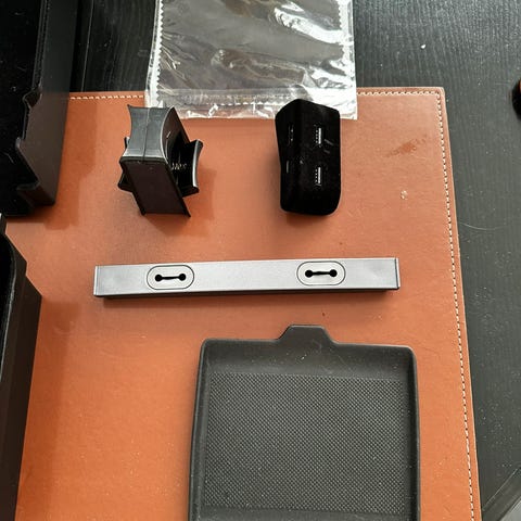 Disse to rumdelere bruges i Tesla model Y 23 til smart opbevaring. Den ene indsats er til det dybe opbevarings rum i midterkonsollen og det andet er til brug i armlænet.