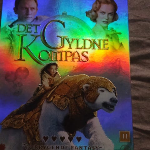 dvd filmen The Golden Compass, viser en scene med hovedpersonen og en stor isbjørn. dvd har et eventyrtema