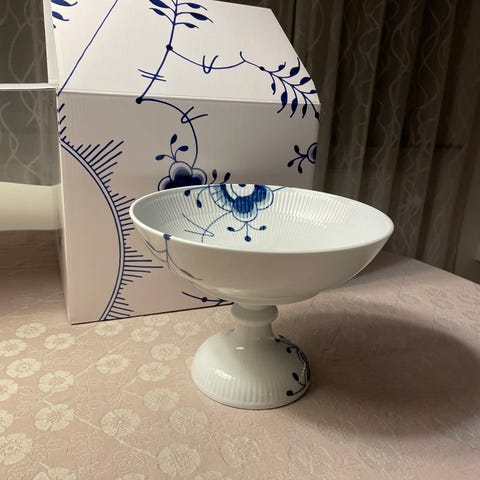 Super flot helt nyt ovalt riflet fad i original emballage. 37 cm langt og 17 cm bredt på midten. "Blue Fluted Mega". Helt intakt og flot i den kendte blå farve.