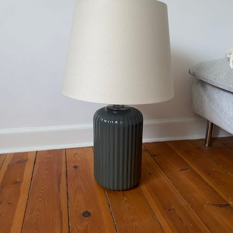 Bordlampe med glasskærm, 45 cm høj, skærmdiameter 19 cm. Med indbygget meget dæmpet "nat-lys-funktion". Udgået Ikea-model med navnet Månskin. Se evt. en anden annonce med standerlampe af samme navn