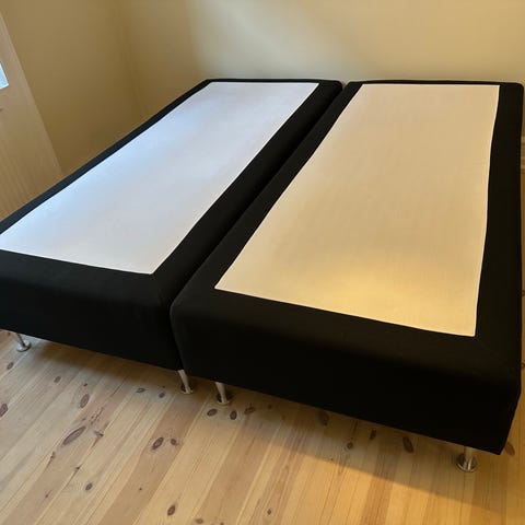 Nocturne 1045 boxmadras GOLD. Der er tale om to enkeltmandssenge (90x200), som jeg har haft sat sammen med metal samlebeslag under rammerne for at holde sengene samlet.
