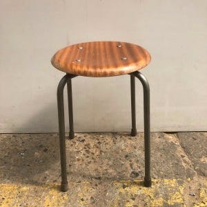 Teaktræs taburet med stål ben. Er original fra 70’erne, og fremstår derfor med brug relaterede spor. Men fin funktionel stand, kommer fra dyre og røgfrit hjem.