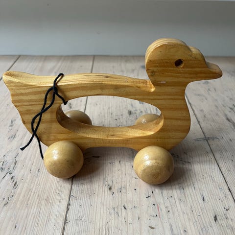 Andet legetøj, Skubbeand, Quercetti, med lyd, flip-flop fødder og baskende vinger, når den skubbes. Sjovt, underholdende og lærerigt skubbelegetøj. Fremstår som ny. Småbørn vil forbedre deres balance og retningsorientering.