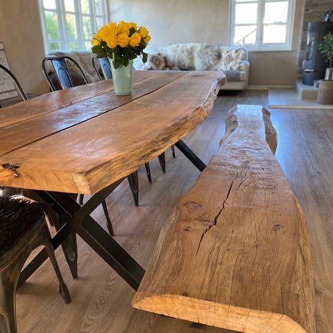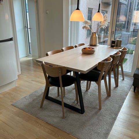Plankebord i massivt og kraftigt egetræ med x ben. der kan påsættes 2 plader til forlængelse. med isatte plader er bordet 83 x 236 cm.