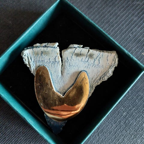 Fin ældre broche i keramik med motiv af tre inuitter af Knud Brøndsted.
