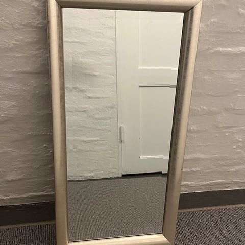 Vægspejl, b: 36 h: 41, Spejl med rustik sølvfarvet træramme. Mini ridse i spejl fladen. Beslag til ophæng både vandret og lodret. Spejl fladen ca. 33,5x18,5 cm.