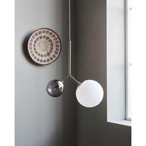 Anden loftslampe, House Doctor, Twice loftslampe fra House Doctor. Lampen er lavet i glas med fine messingdetaljer. Den er asymmetrisk og har en større hvidmatteret glaskugle og en mindre i gråt røgfarvet glas.