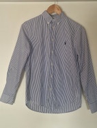 Lækkert, original Rolf Lauren skjorte, hvis med mørke blå striber. Str. 14-16. Brugt meget få gange, derfor i meget pæn stand .