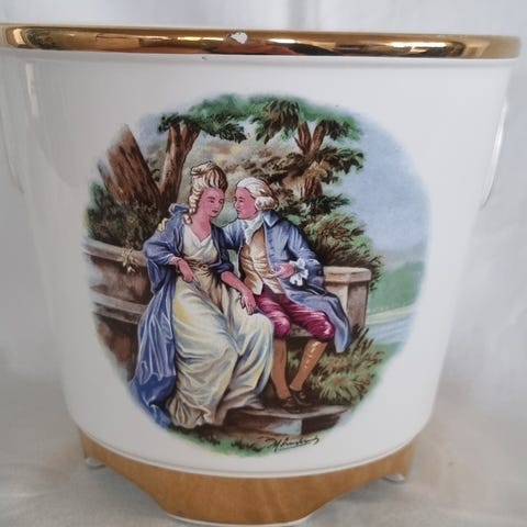 Flot og intakt blå urtepotteskjuler Søholm håndmalet. Måler 15,5 cm i højde og 16 cm i bredde foroven