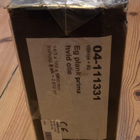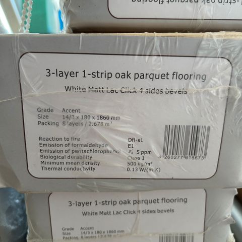 Overskud efter renovering haves 2 kasser svarende til 2x3,17 kvm, 1 ubrudte kasser samt en åbnet dog alle brædder intakt. Sælges samlet, afhentes i Humlebæk