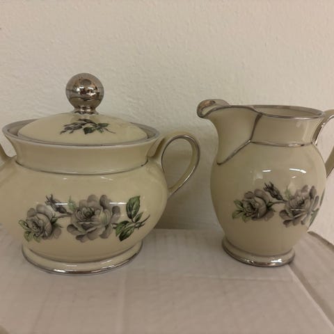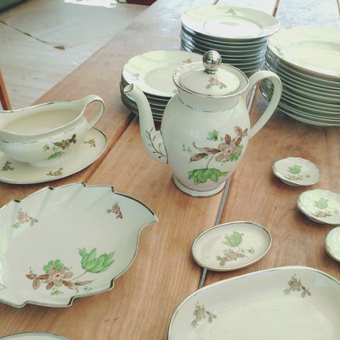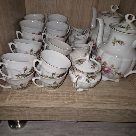 Fint kaffestel fra 30'erne - 14 kagetallerkener, 14 underkopper, 13 kopper - en med en skade, 4 fade, et par kandisholdere, en vase og en aflægge-ting
