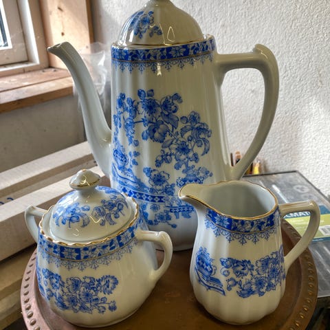 Kaffekande, sukkerskål, flødekande Scherzer Bavaria Germany. Art deco i porcelæn og i fin stand, kun flødekanden har et lille skår, se foto 9. Pris: 210 kr.