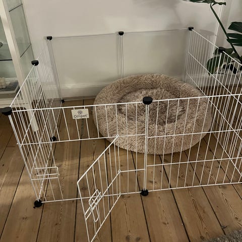 Buret har to låger en i enden og en på langsiden hvor hvalpen nemt kan tages ud fra.