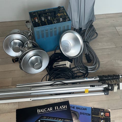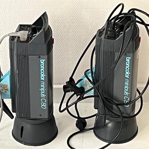 Flash - Flashanlæg bestående af to hoveder, to stativer og to stk. softboks/softbox, to kabler til strøm samt et udløserkabel. Der er et ekstra hoved, så der er tre flashhoveder i alt.