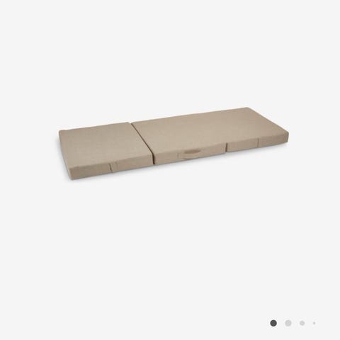 Jeg har denne skønne og bløde legemadras, som kan foldes på mange måder. Den kan foldes helt ud og perfekt til de mindste. Den kan også foldes, så den kan stå på ad en væg eller i et hyggehjørne og bruges til f.eks. højtlæsning.