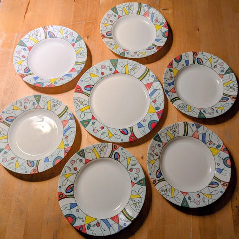 6 flade tallerkner, ø 23 cm. Pris 270,-