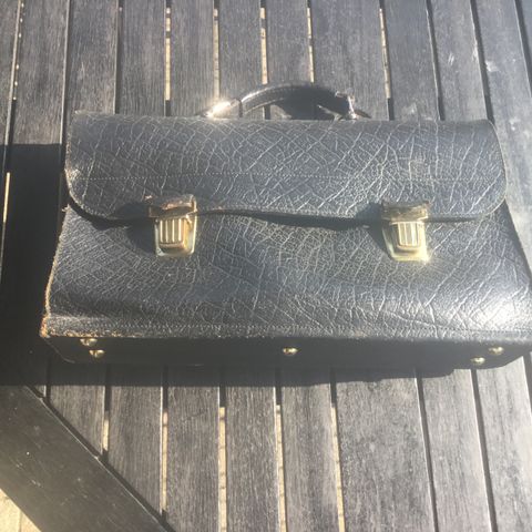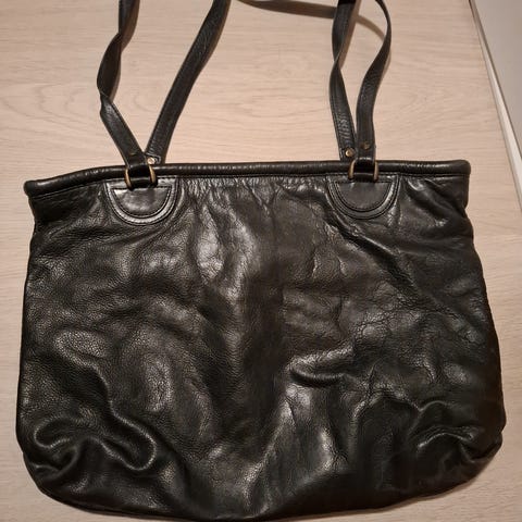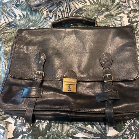Sort lædermappe med hank og skulderstrop, Bredde 37 cm, højde 26 cm, dybde 10 cm dvs den kan rumme A4-papirer og en labtop. Der er 2 rum og en lomme med lynlås indvendigt. Foret er grønt og rødt. Tasken er brugt, men er hel. Der er mindre brugsspor. Kan ikke sendes.