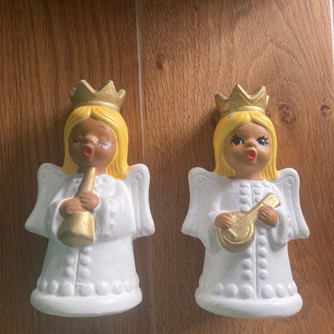 Engle, lysestager, julepynt, retro, To ældre, meget smukke engle-lysestager i metal: