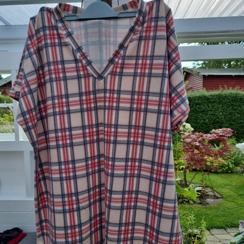 Blusen er 60 cm lang og over brystet måler den 2 x 48 cm. 70% polyester, 26% rayon og 4% spandex